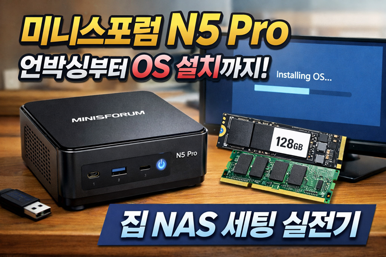 오늘 미니스포럼 N5 Pro가 드디어 도착했습니다. ^^그런데… 저는 첫날부터 한 번 크게 삽질을 시작합니다.**SSD 128GB / 메모리 16GB가 ‘같이 왔는데...