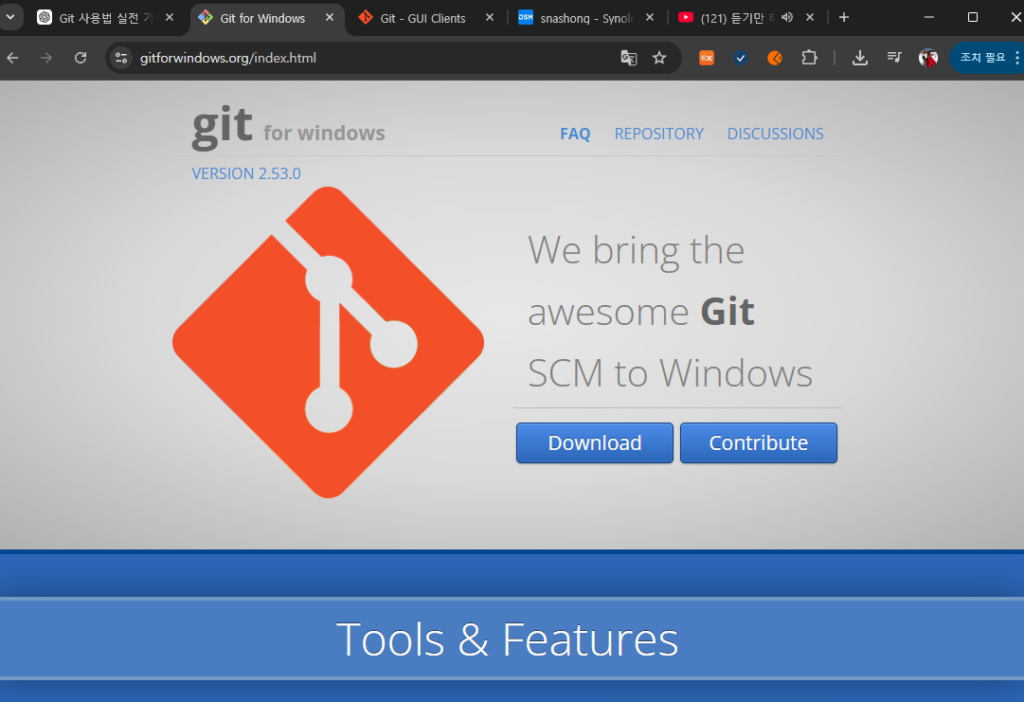 • Windows는 Git for Windows(공식 안내/다운로드 링크 제공): Git SCM Windows Install
